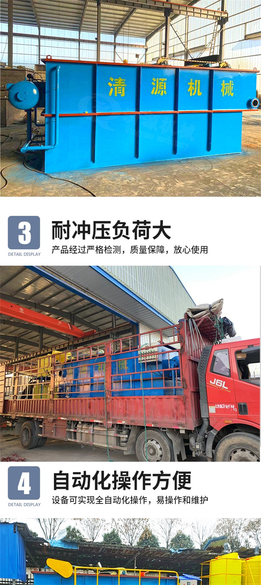 結(jié)構(gòu)特點(diǎn):設(shè)備主體為長(zhǎng)方形鋼制結(jié)構(gòu)。主要部件由溶氣泵、空壓機(jī)、溶氣罐、長(zhǎng)方形箱體、氣浮系統(tǒng)、刮泥系統(tǒng)等組成。