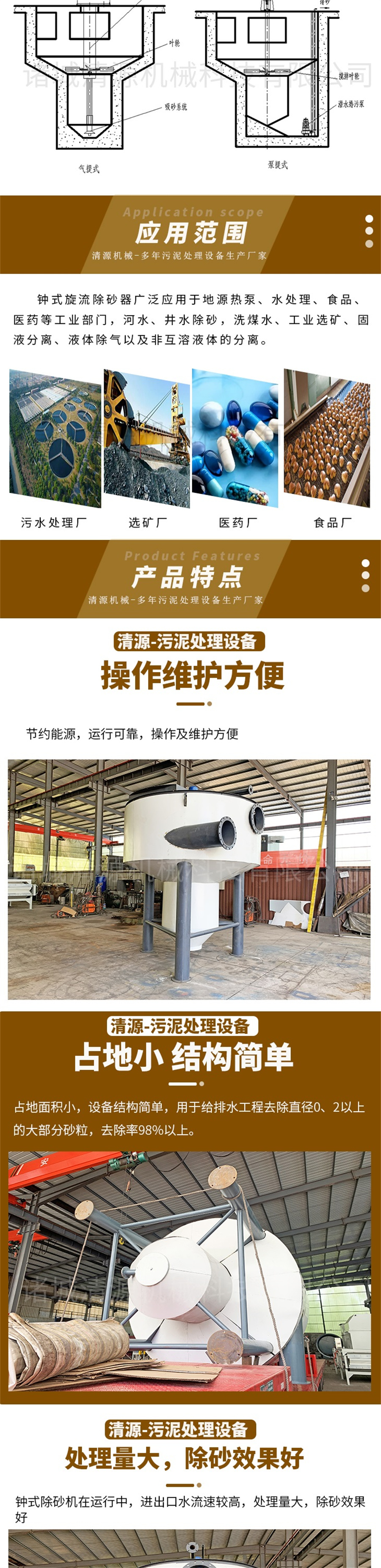 螺旋鐘式除砂機系統(tǒng)在運行中,進出口水流速較高,處理量大,出砂效果好,占地面積小,設(shè)備結(jié)構(gòu)簡單,節(jié)約能源,運行可靠,操作及維護方便,適合大中小型污水處理廠使用。