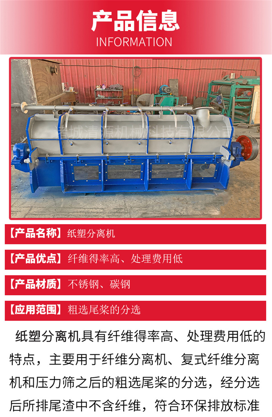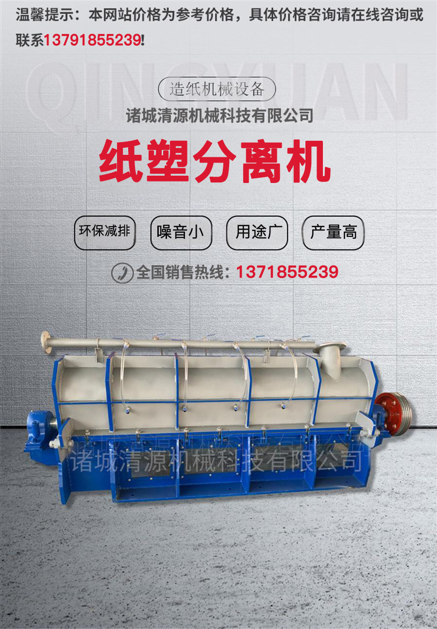 諸城清源機械生產(chǎn)的紙塑分離機包括一焊接的組裝主體,主體支撐著篩板、轉(zhuǎn)子、收集槽、渣滓排放槽和支架,它是水平安裝的。